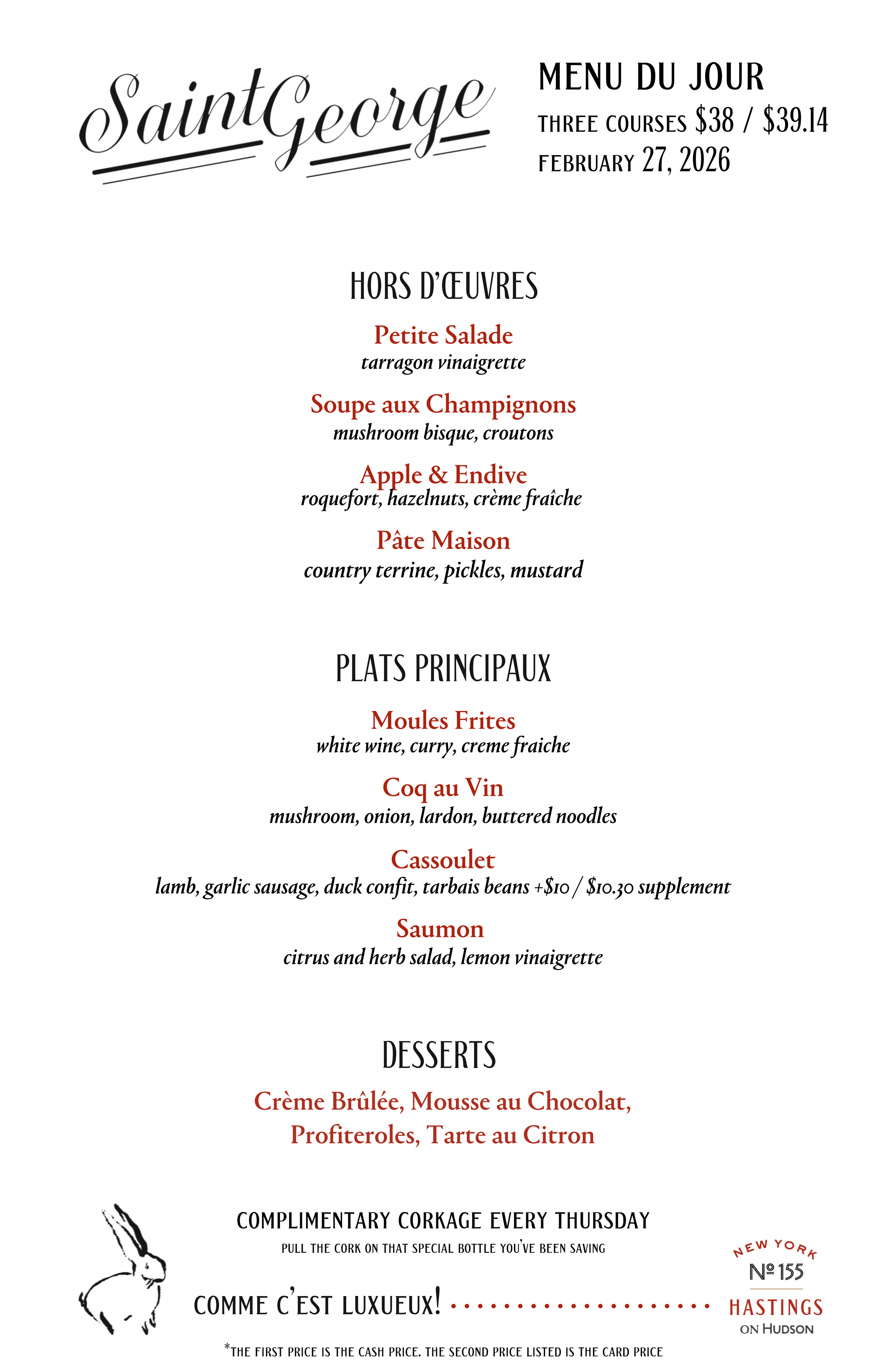 Dinner served every night at 5pmWeekday Lunch served Monday to Friday 11:30am to 2:15pmWeekend Brunch served Saturday and Sunday 11am-2:15pm Nightly Menu du Jour Three Courses, $38Menu changes day to dayNot offered on holidays MENUS