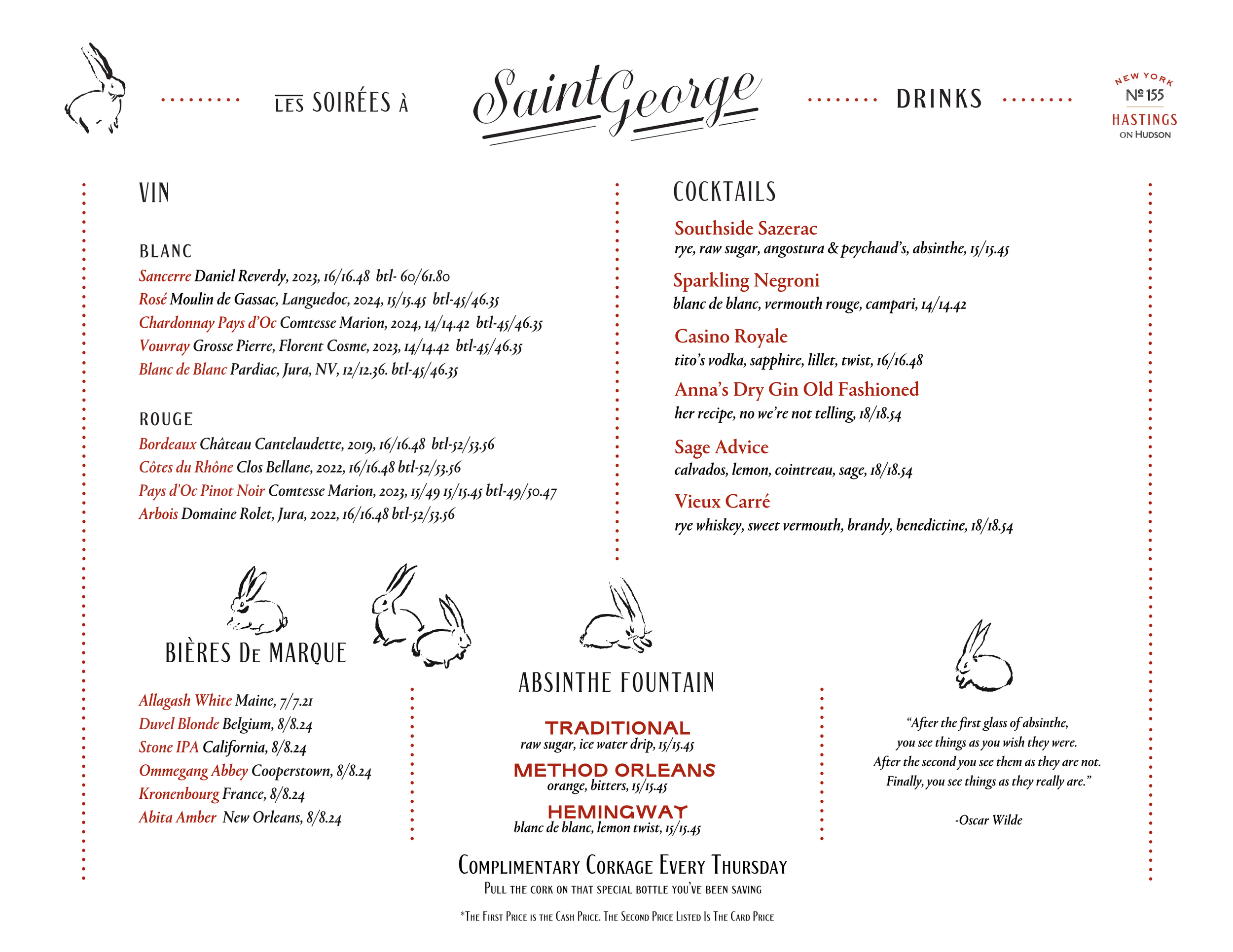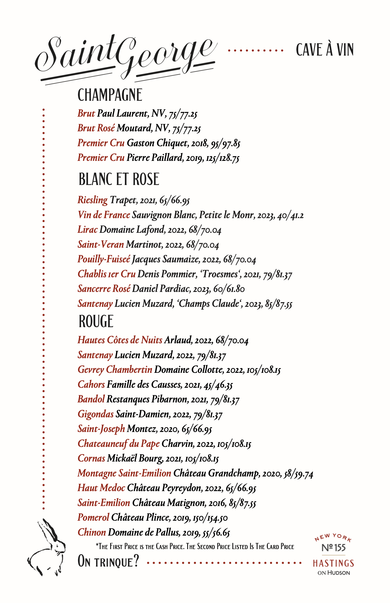 Serving dinner every night 5pm-10pmWeekend brunch Sat & Sun 11am-3pm Nightly Menu du Jour Three Courses, $38Menu changes day to day.Not offered on holidays. MENUS